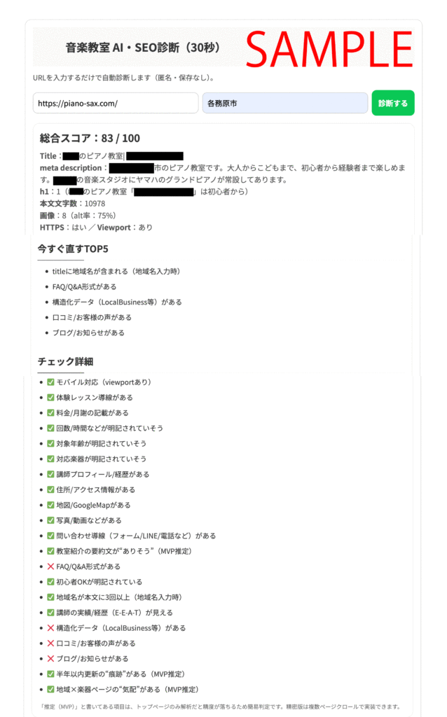 URLを入力するだけで自動診断します(匿名・保存なし)。
