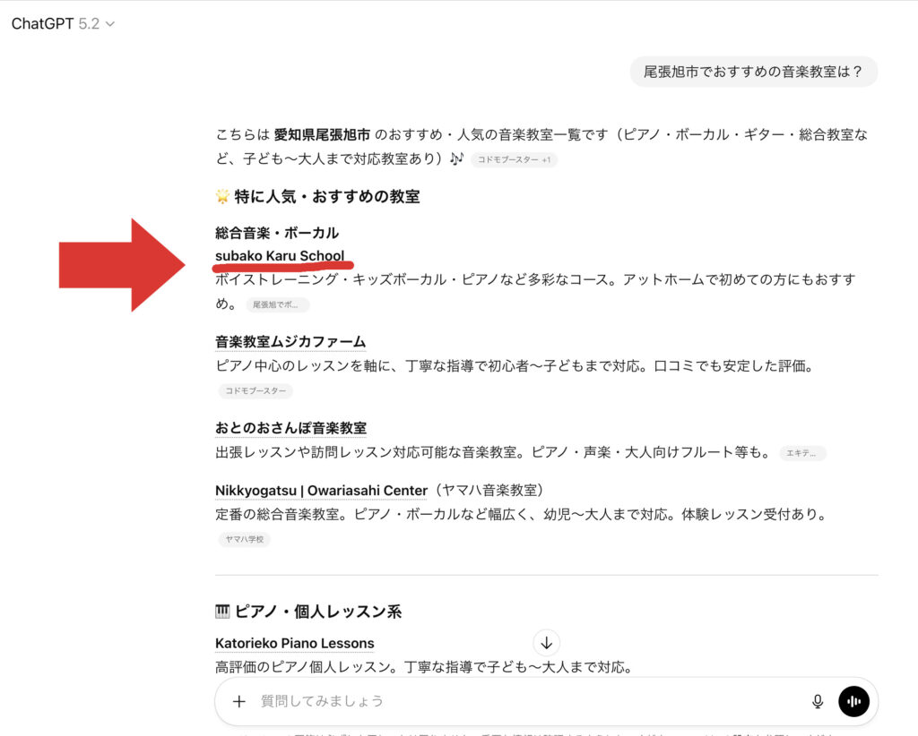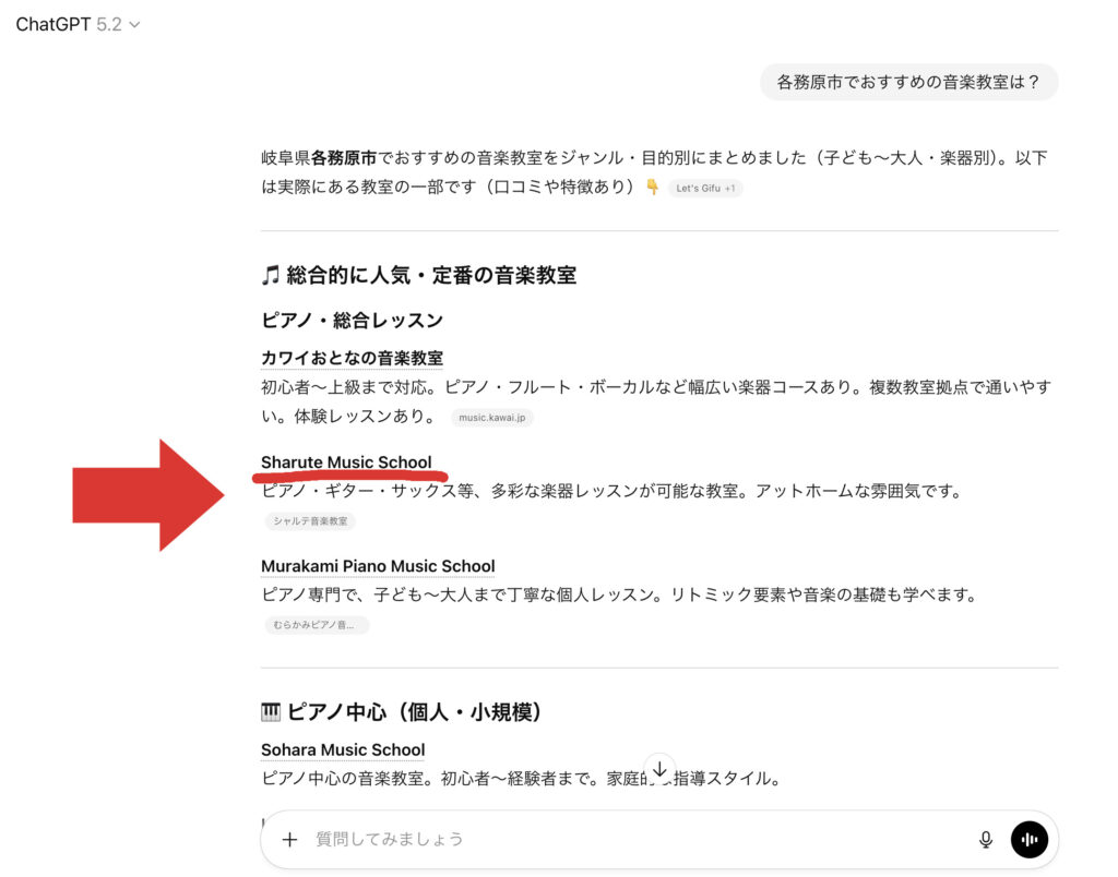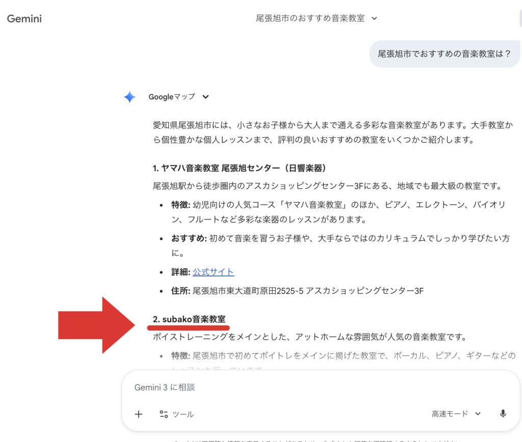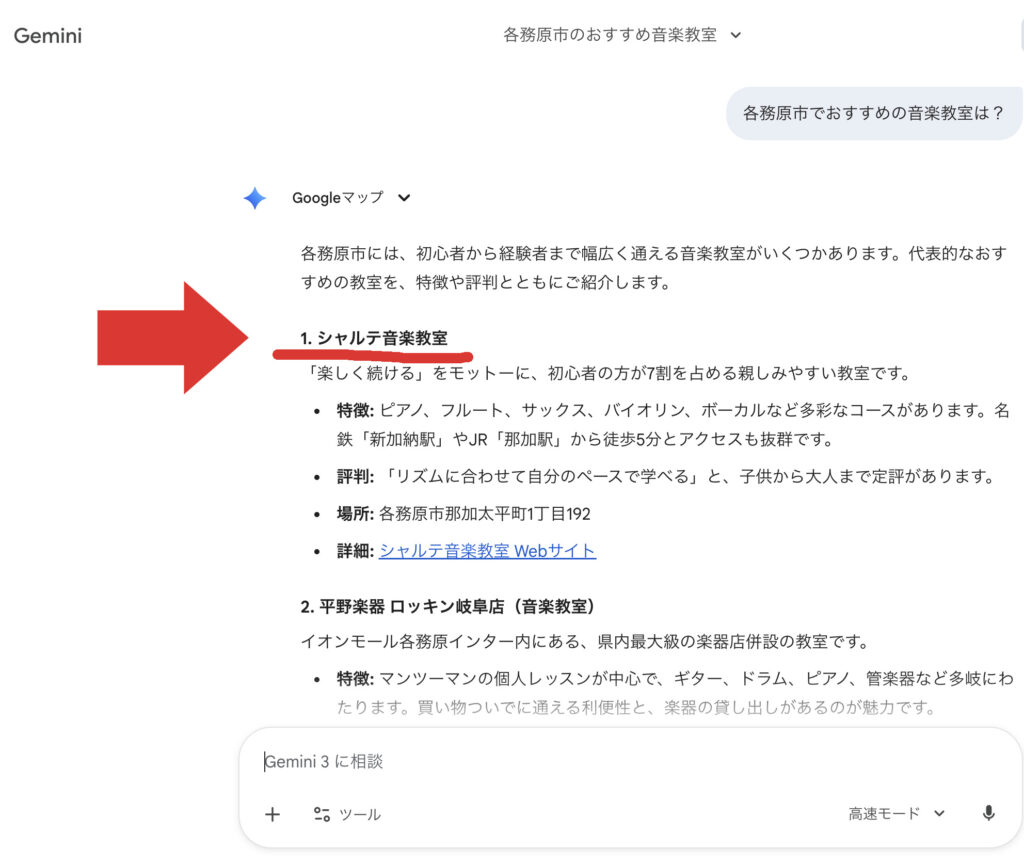 また最新のAI対策にも対応中。ChatGPT、Geminiどちらに聞いても教室のサイトが表示されています。